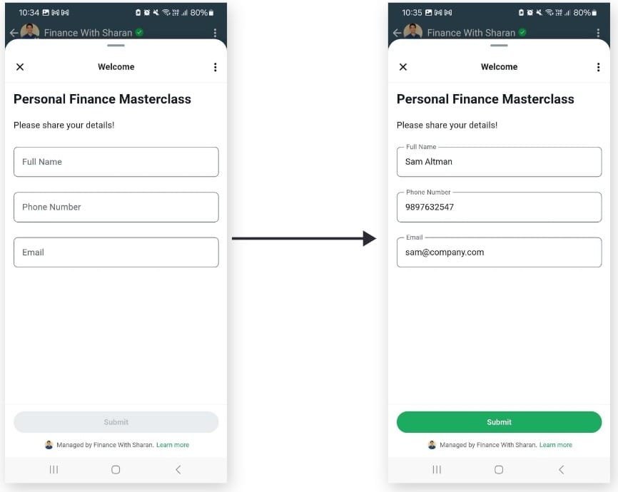 Design the form to capture attendee details, then confirm their registration and send event information directly via WhatsApp.